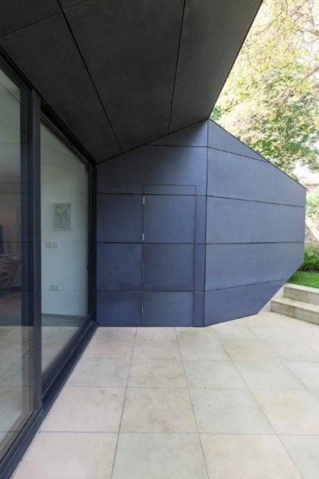 La nuova struttura, progettata per migliorare e aumentare lo spazio della casa, è formata da due volumi geometrici sovrapposti. Al piano terra ospita una cucina/sala da pranzo “open space”, accessibile dal giardino attraverso porte scorrevoli in vetro, mentre al piano superiore diventa un’ampliamento in aggetto dello studio ubicato che si affaccia sul giardino.