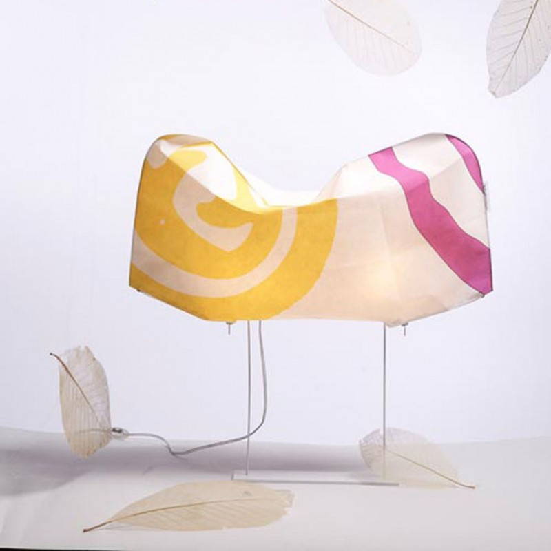 Charlotte è una lampada che ricorda la forma di una nuvola, ed è realizzata con un materiale che permette di modellarla continuamente a proprio piacere: si tratta del Drop Paper, un particolare tipo di carta dall’aspetto solido e strutturato composto da poliestere, fibra di vetro e cellulosa. È ignifugo ed ha un’ottima reazione alla luce, per cui qualsiasi forma si dia al volume della lampada l’effetto luminoso sarà sempre garantito. Inoltre, grazie alla buona presa del colore su questo materiale, Amado ha potuto fare di Charlotte una tela su cui posare disegni, fantasie e scritte diverse, rendendola versatile ed adattabile ad ogni ambiente.