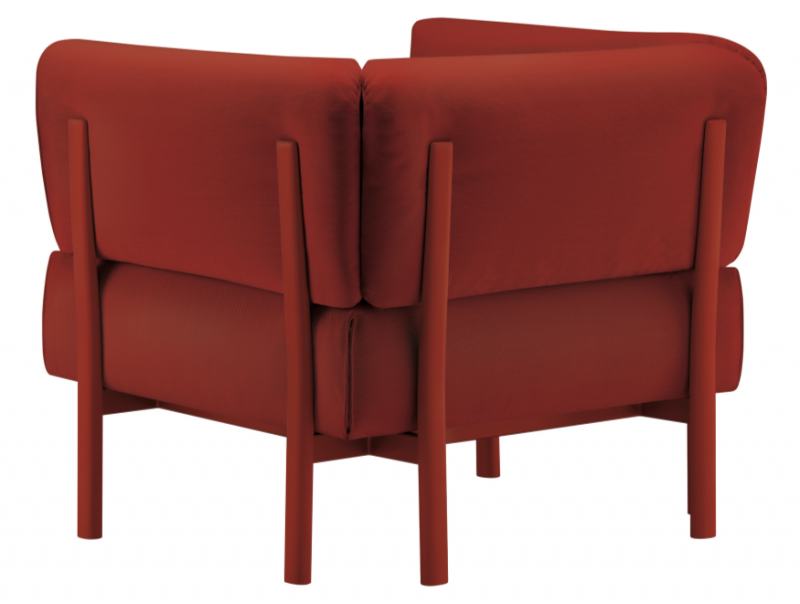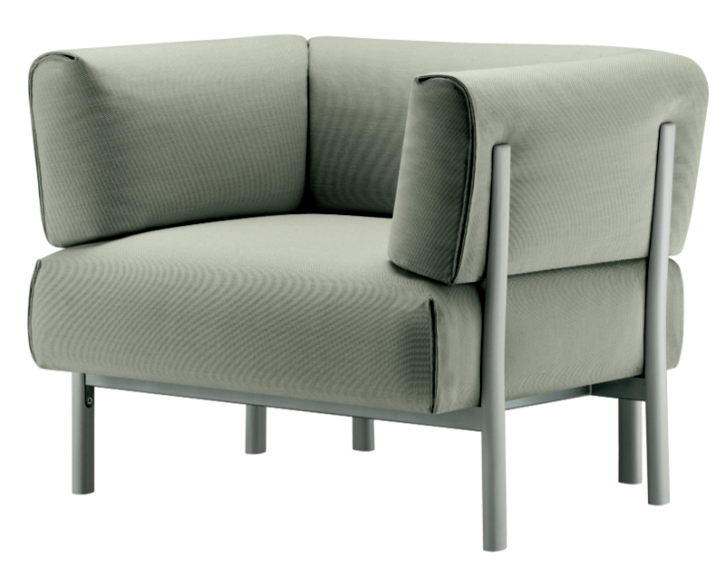 Un elemento strutturale che diventa anche estetico circondando in maniera piuttosto evidente la morbida imbottitura e dando alla poltrona (e al divano, anche se qui per le maggiori dimensioni il gioco si perde un po’) un fascino tutto particolare.