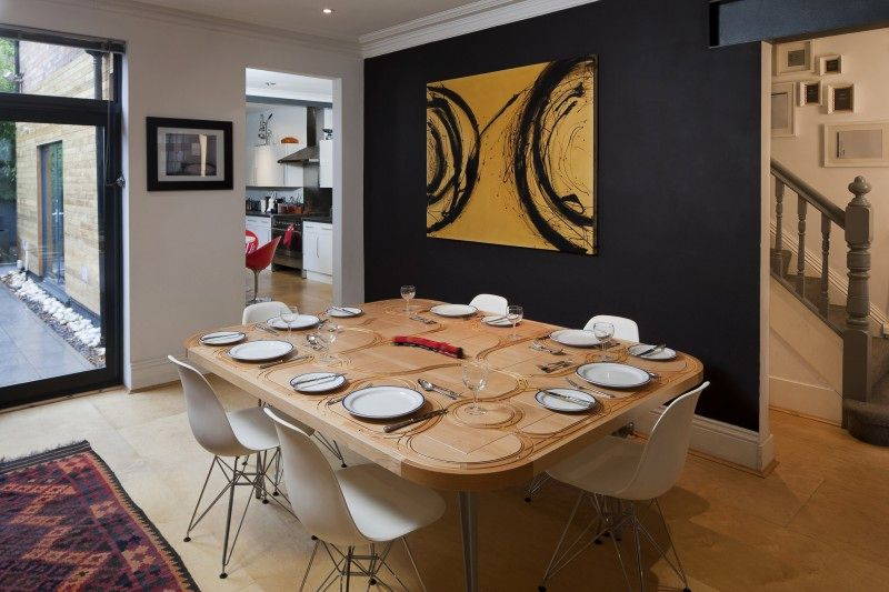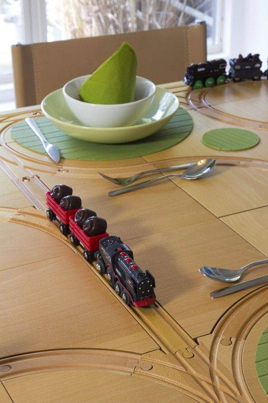 Stare a tavola tutti insieme può diventare un momento più divertente per i bambini, sicuramente a loro agio su una pista che ricorda quella delle loro macchinine. Basti pensare che le tabelle che compongono il tavolo sono progettate, realizzate e distribuite da quello che Three Foot Three Design ritiene essere il sistema ferroviario in legno migliore del mondo: quello della Brio Marbel Ltd, famosa nel mondo dei giocattoli.