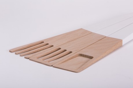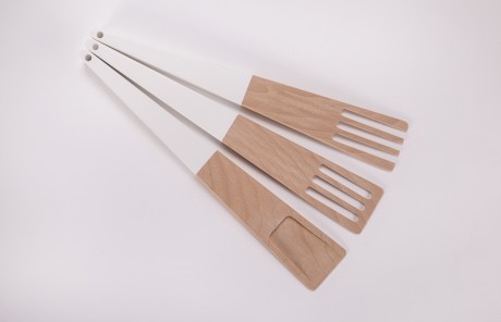 A Riva, si aggiungono le posate di servizio Cato, anche queste in faggio, che assume delle forma particolarmente simpatiche grazie a un lavoro di fresatura a controllo numerico. Il set di tre pezzi; spatola, forchetta e cucchiaio, è stato progettato per adattarsi a tutti i tipi di cucina.