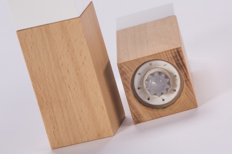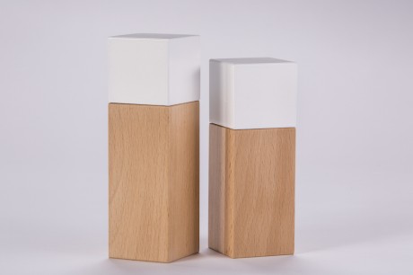 Si tratta di Riva, un set di macinini per sale e pepe dalle linee geometriche estremamente pulite, formate da un corpo in alluminio bianco con una finitura in faggio, con un sofisticato meccanismo in ceramica per macinare le spezie.