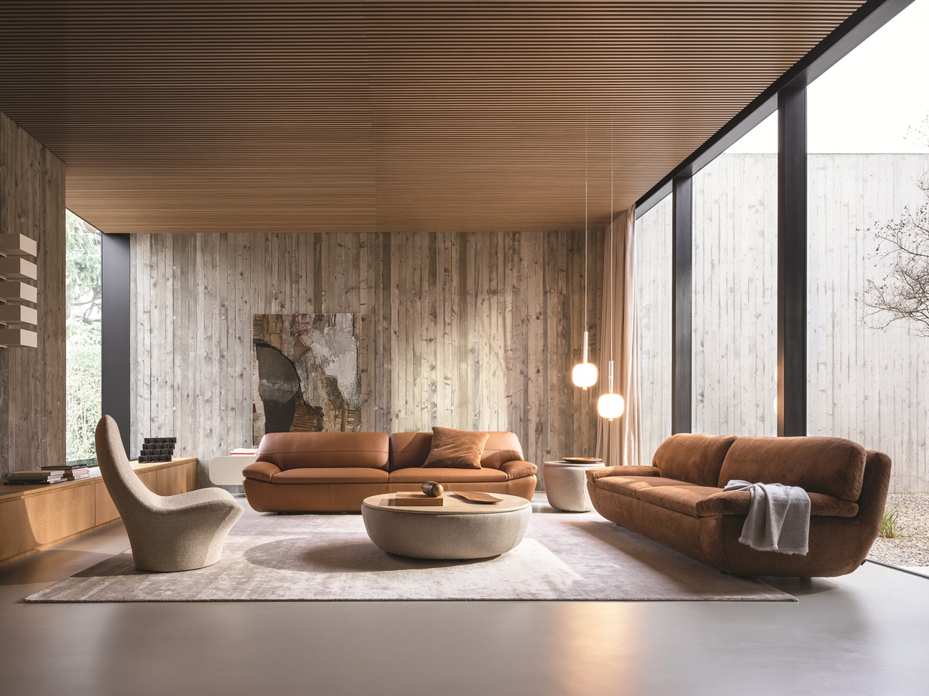 È un dettaglio l’elemento distintivo di B.E.L.T.: una cintura in pelle intrecciata che avvolge i generosi braccioli, contenendo il volume del divano, arricchita da un’elegante fibbia personalizzata con il monogramma “T” dell’azienda. Un dettaglio che richiama l’alta pelletteria su misura, trasformando il divano in un oggetto contemporaneo da collezione. Anche i complementi di B.E.L.T., come il tavolino integrato rivestito in pelle, fanno parte di un sistema aperto e flessibile, definito da dettagli sartoriali.