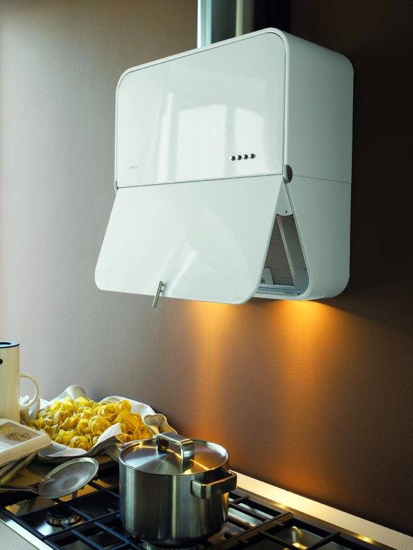 Clip è caratterizzata da una geometria elementare, un semplice rettangolo dagli angoli arrotondati ma esaltato da una sottile cornice a contrasto. La cappa si restringe in profondità nella parte inferiore, dove è ospitato uno sportello basculante che nascondendo il cuore centrale aspirante.
