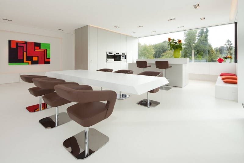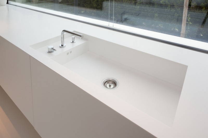 Oltre alla singolare e insolita forma dell’edificio, il progettista Karl Dreer ha posto grande attenzione all’uso dei materiali: ecologici, naturali e traspiranti. Anche per ottenere un bilancio energetico ottimale. La struttura della casa è realizzata in legno lamellare certificato che offre opzioni aggiuntive per la distribuzione del carico. I singoli componenti sono stati trasportati e consegnati sul posto così il “guscio” della casa è stato costruito in soli pochi giorni. Un tamponamento delle pareti in materiali naturali e isolanti, finiti con un intonaco minerale bianco trasparente ha dato il tocco finale. Per gli interni, negli arredi fissi, nei bagni come in alcune finiture della facciata, è stato largamente utilizzato l’innovativo materiale acrilico Hi-Macs®, un materiale naturale bianchissimo, resistente come la pietra ma facilmente lavorabile al pari del legno.