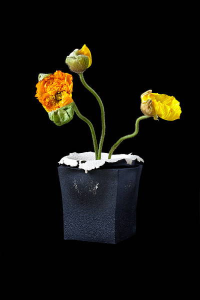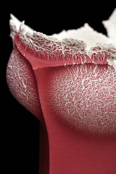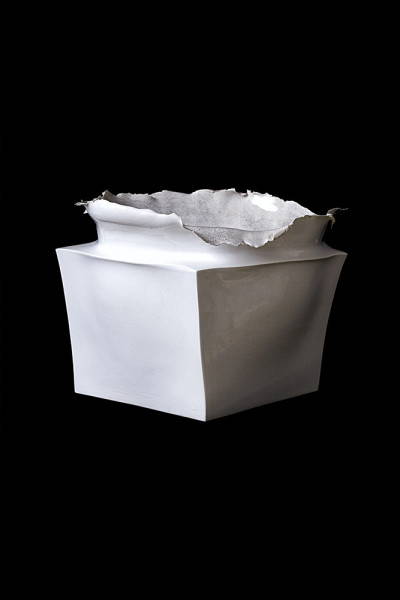 Così, forme di ceramica refrattaria bianca sono state scolpite in blocchi geometrici di argilla dai grande spessore e colorate quando la materia era ancora fresca. In un secondo momento sono state fatte esplodere e proprio il momento dell’esplosione è stato fissato nella materia. Il risultato sono blocchi di ceramica colorati che mostrano la consistenza della ceramica bianca e, allo stesso tempo, rendono evidente la pesantezza e la fragilità della materia. I vasi sono prodotti da Alessio Sarri Ceramiche.