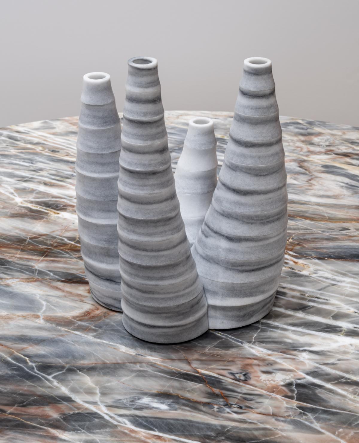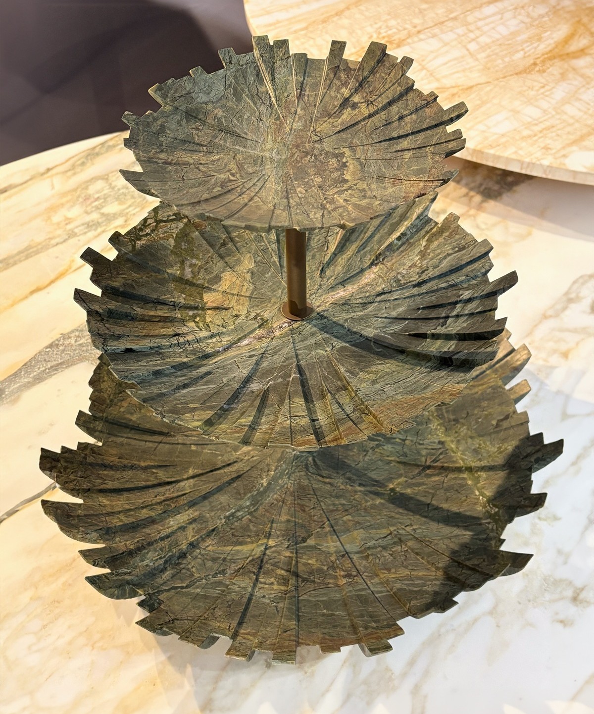 Gli otto centritavola che compongono la collezione si caratterizzano per la varietà dei marmi policromi – tra cui la Sodalite, il Confusion Red, il Calacatta Antico e l’Emerald Quarzite – per le linee scolpite e per i decori che ne esaltano la tattilità. Ogni pezzo è una piccola architettura domestica che invita alla contemplazione e all’esperienza fisica della materia, in cui tecnologia e arte dialogano armoniosamente.