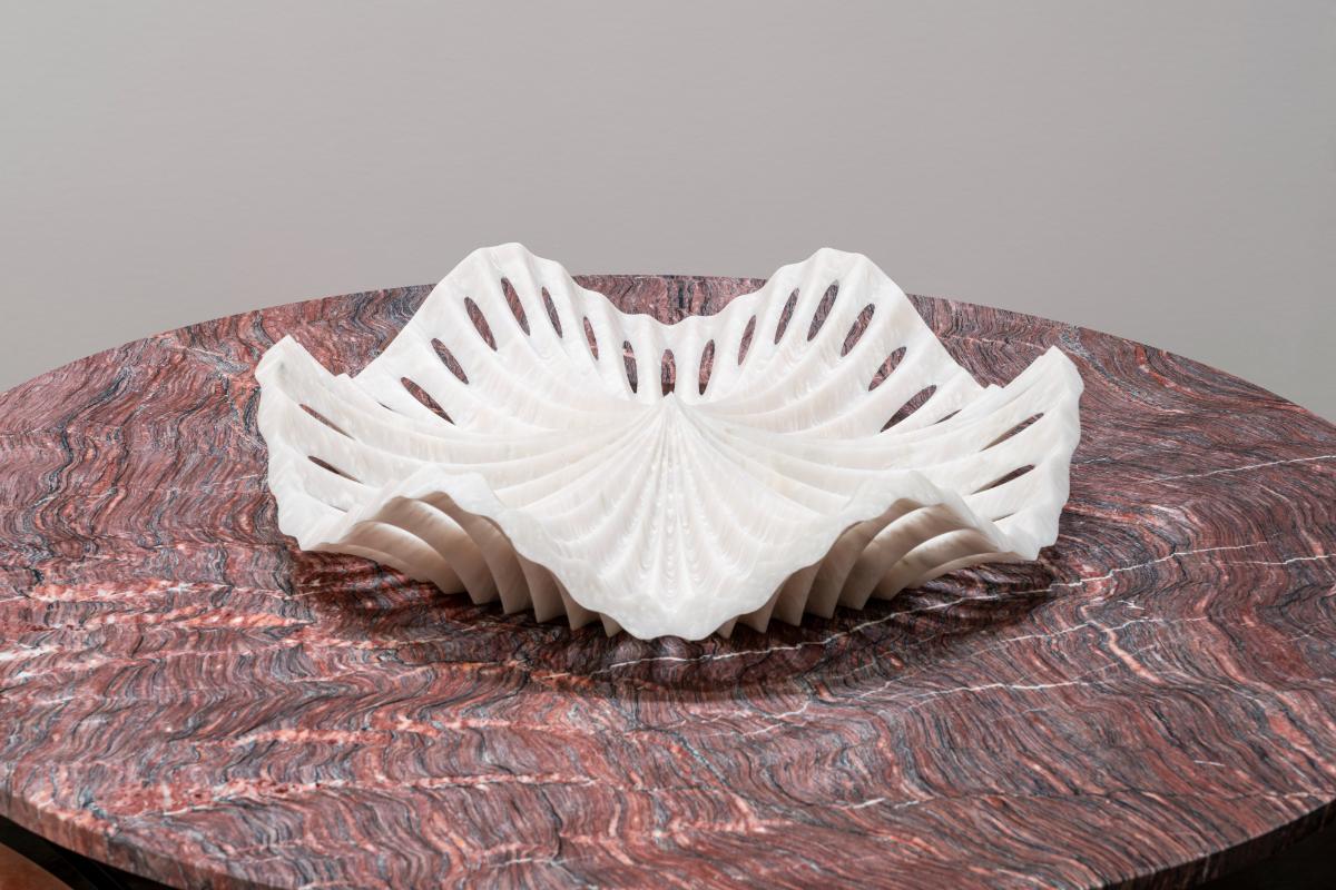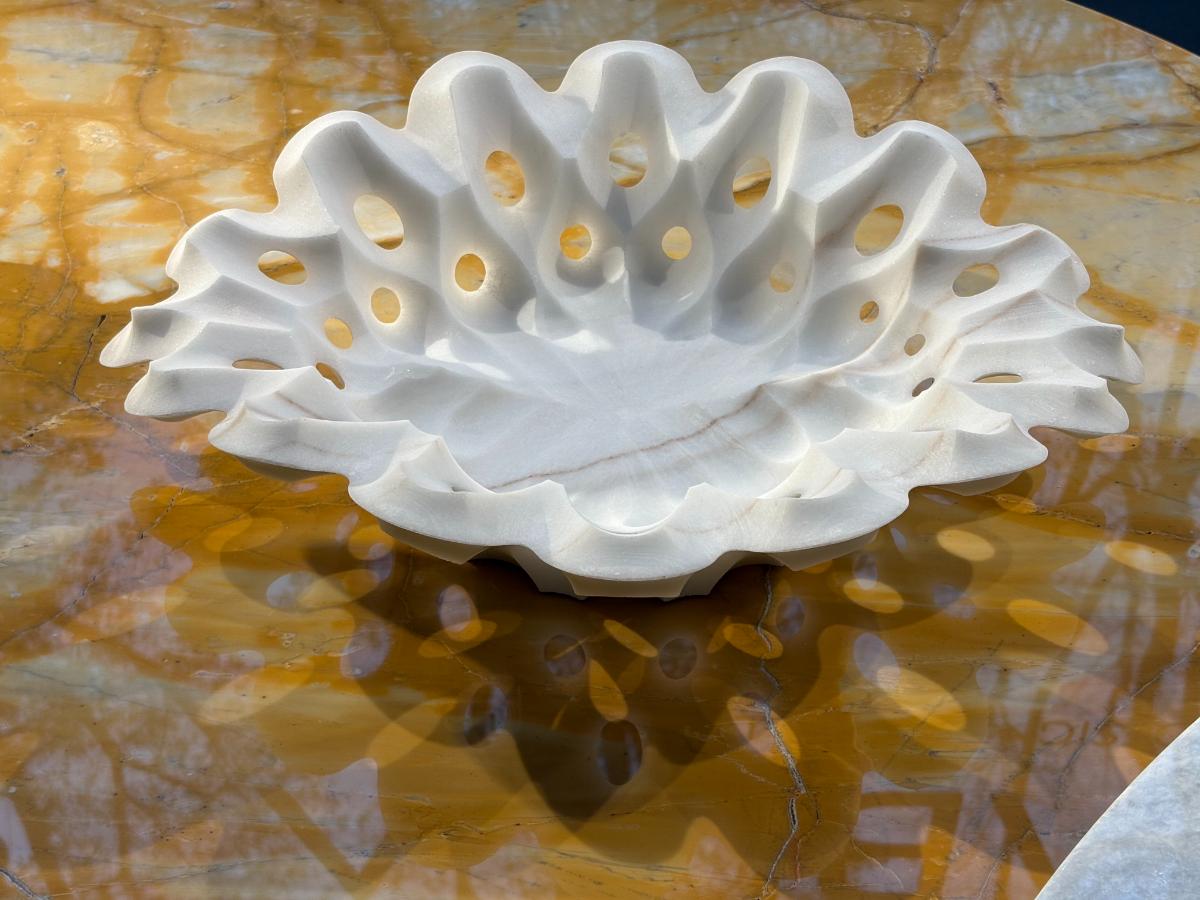 Un lento processo di disvelamento che prende vita con la progressiva rimozione del massello o il taglio della lastra di marmo, eseguito con utensili di alta precisione portati al limite della tecnologia. Seguendo un disegno predefinito, la lavorazione genera oggetti capaci di accogliere frutta o altri elementi, ma anche di attrarre lo sguardo e accompagnarlo verso il centro del piano del tavolo.