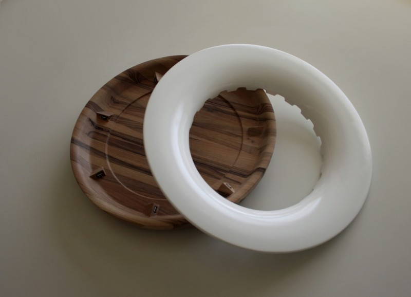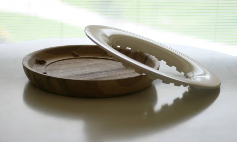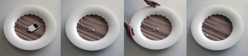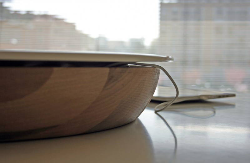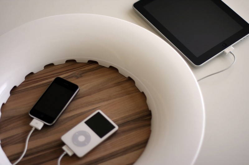 Enrico e Isabella sono i fondatori dello studio di design en&is, e lavorano a progetti che riescano ad unire davvero funzionalità ed estetica. Il loro Uffo apparentemente è solo una ciotola in legno e ceramica, ma il sistema tecnologico racchiuso al suo interno ne fa un oggetto utile e pratico. Si tratta di una vera e propria dock station per ricaricare tramite cavi usb qualsiasi dispositivo, che si tratti di un iPhone, un Ipod, o una macchina fotografica. Uffo è alimentato da corrente elettrica, e sotto la sua cornice di ceramica (facilmente estraibile) si nascondono tante prese usb alle quali è possibile collegare il dispositivo che ha bisogno di essere ricaricato. Grazie ai “dentini” dell’anello, ogni filo si arrotola ordinatamente e rimane nascosto, evitando di creare fastidiosi intrecci e grovigli.