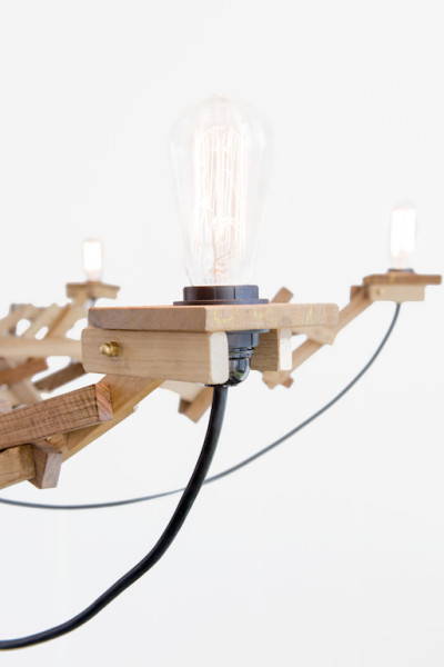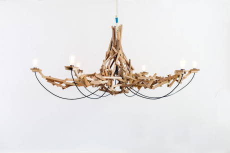 Chiunque produca qualcosa sa quanto sia difficile non sprecare. Esattamente questa è la base del “Chaos Chandelier”, il lampadario ecologico e riciclato disegnato dallo studio olandese Pepe Heykoop. Chaos Chandelier è un lampadario a sei bracci di grandi dimensioni (225 cm di diametro per 100 di altezza) composto da pezzi di legno massello, tutti diversi nella forma, lunghezza e colore, recuperati dagli scarti da una segheria locale ed è disegnato con una voluta immagine casuale, caotica e grezza.