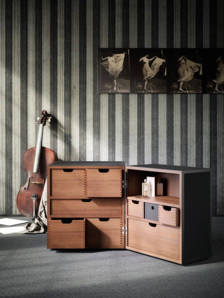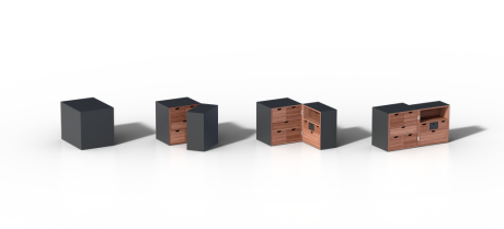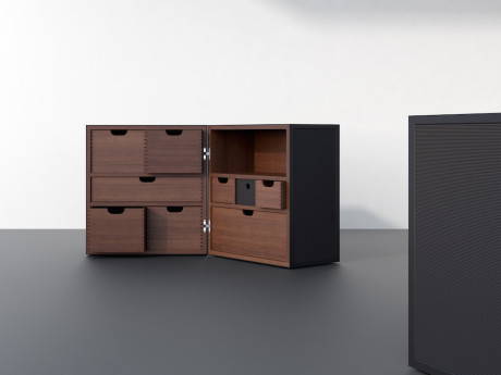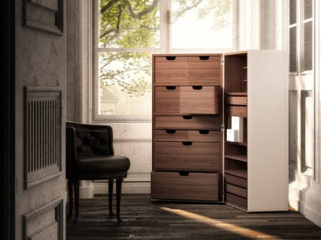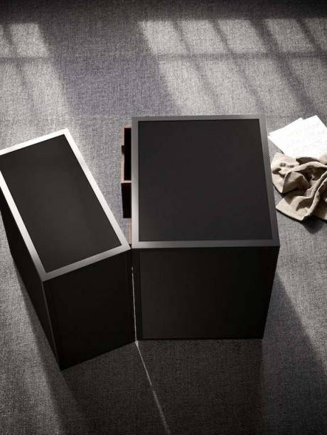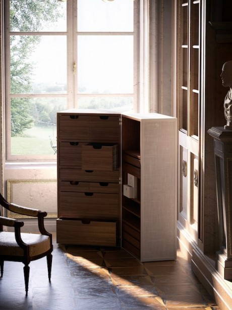 Oggetto simbolo della collezione – e non solo per il nome che porta, Chatwin, citando il grande viaggiatore e scrittore britannico- , è un elegante e modernissimo contenitore apribile che cita i suggestivi bauli da viaggio d’altri tempi: è realizzato in legno naturale e interamente rivestito in Acrilic Solid Surface inciso con decorazione geometrica. La raffinatezza di Chatwin è evidente dai particolari: all’interno è dotato di parti mobili che ospitano vani e cassetti in noce assemblato, con incastri a pettine a vista e maniglie in camoscio, dove è anche possibile applicare piccole iscrizioni personalizzate.