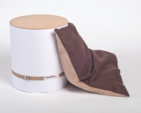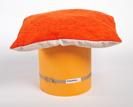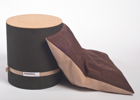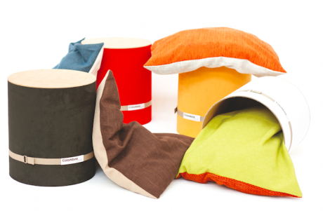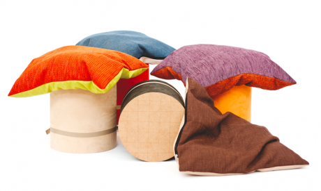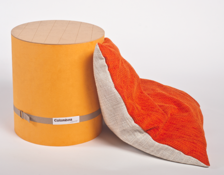 L’idea è molto semplice: un tubo che contiene un cuscino e che si trasforma in un pouf. I tessuti dei cuscini sfoderabili sono cuciti a mano mentre tutte le imbottiture interne sono state realizzate utilizzando filo di cotone recuperato dall’industria alimentare. Anche il cartone e il legno che compongono il corpo del pouf sono in materiali riciclati e lavorati a mano.