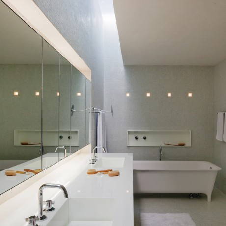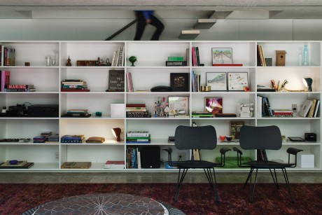 Ai piani superiori, diversi schermi in metallo possono essere fatti scorrere attraverso le finestre per garantire la riservatezza delle camere da letto, della sala TV e dell’office che si trovano dietro la nuda facciata in cemento.