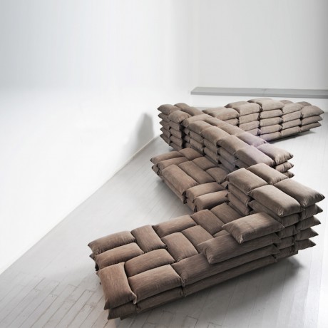Softreventment. Divano componibile realizzato con struttura in legno e imbottitura in “morbidi” sacchetti di sabbia. TARAZI DESIGN STUDIO