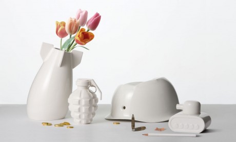Love&Peace. Elmetto contenitore, bomba salvadanaio e carro armato temperamatita. Tutto in candida ceramica. Un ironico omaggio alla pace di BIAUGUST DESIGN.