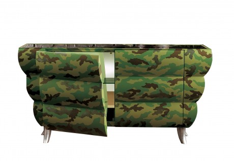 Cin Cin. Mobile bar contenitore dalla finitura mimetica forse pensato per la tenda di comando. All’interno, specchi e illuminazione. FRATELLI BOFFI