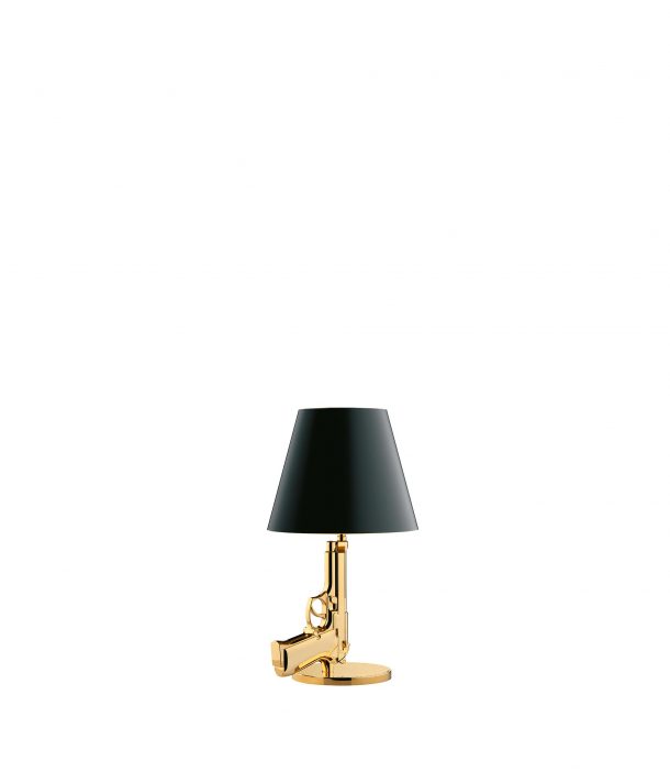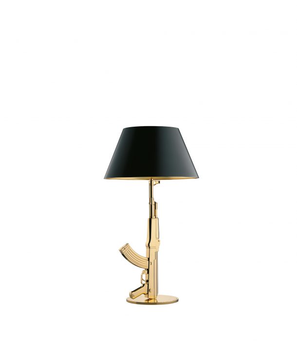 Gun. Lampada da tavolo disegnata da Philippe Starck per FLOS. Come base, un Kalashnikov dorato. Esiste i 3 versioni: Pistola e Mitraglietta (Table Gun) e Fucile (Long Gun).