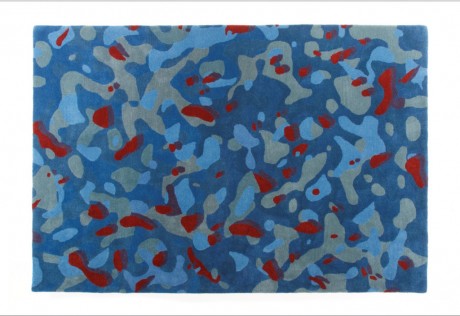 Tappeto. Disegni mimetici sul tappeto Camouflage Macro in lana annodata a mano in India, disegnato da Alberto Artesani per NODUS nei toni tradizionali del verde militare o quelli più vivaci e insoliti dell’azzurro