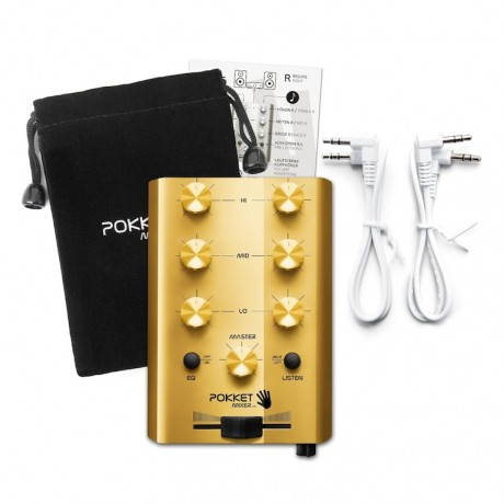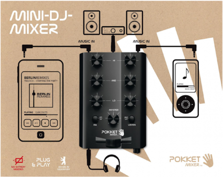 Il PokketMixer è un piccolo dispositivo, pratico e facile da cablare, che è pronto in soli 30 secondi. Così chiunque spontaneamente trasformarsi in un DJ con facilità ovunque e in ogni occasione, dato che ha le funzioni di un vero mixer professionali ma il tutto è contenuto in un coloratissimo apparecchio tascabile che pesa solo 130 g. Non necessita di alcuna unità di alimentazione e funzione senza inutili prese multiple e senza dover connettere decine di cavi.