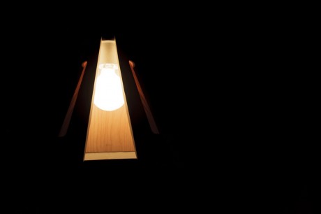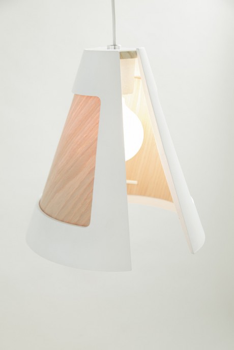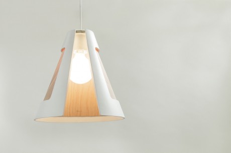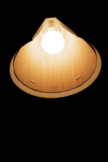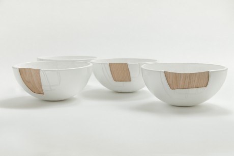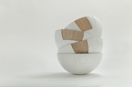 La lampada Cono n° 1, un mix di ceramica e legno tagliati ad arte e la ciotola HN/Made, realizzata con le stessa tecnica e segnata sulla superficie esterna da una texture geometrica.