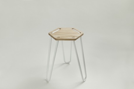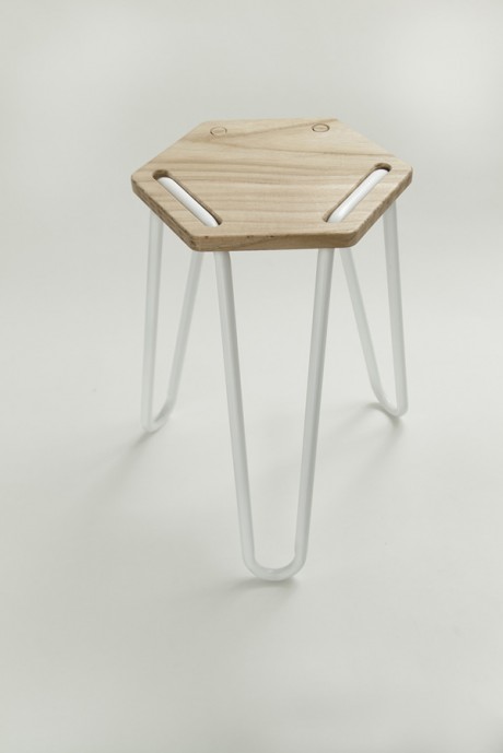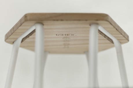 Lo sgabello tri HEX, dove un unico elemento tubolare curvato ad arte forma la struttura che si incastra, senza viti o colle, nella seduta esagonale in legno.
