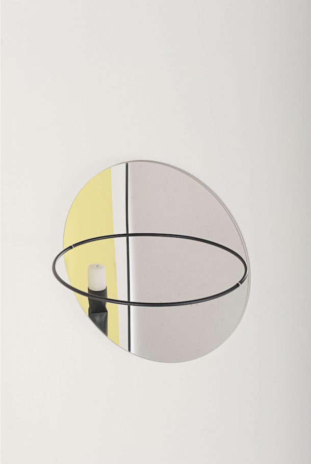 Partiamo con All around: un appendiabiti/specchio, una mensola e un porta‐vaso disegnati da Anna Mercurio, che sceglie il cerchio come elemento distintivo.