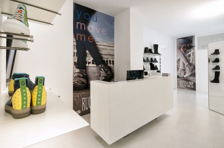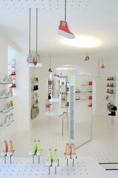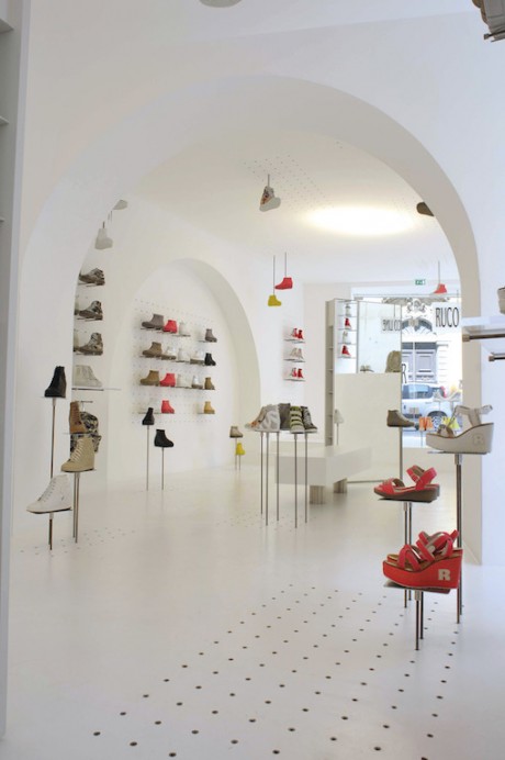 Il concept rispecchia la filosofia creativa di Jean Nouvel, che si caratterizza per la linearità e l’essenzialità. All’interno, tutto sui toni del bianco, si alternano due materiali: l’acciaio e il gesso. Il risultato è uno scenario neutro sul quale si stagliano le calzature, che diventano protagoniste come in una galleria di quadri.