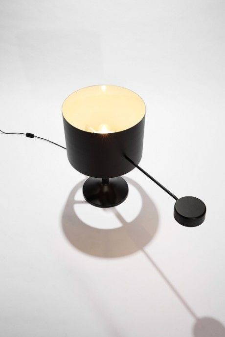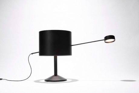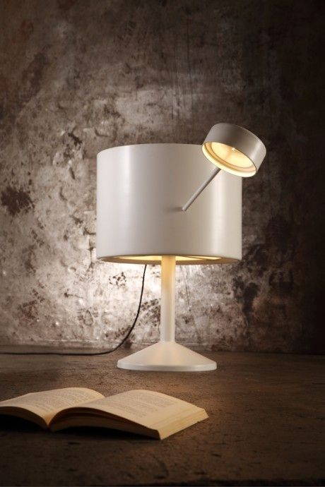 Un corpo la cui forma ricorda quella di una grande abat-jour, viene “trafitto” da un sottile braccio che sostiene una luce spot a LED. È così possibile avere un’illuminazione d’atmosfera oppure una luce spot, più adatta per leggere o lavorare. Il braccio ruota insieme al paralume della lampada, così da poter direzionare la luce dove è necessaria.