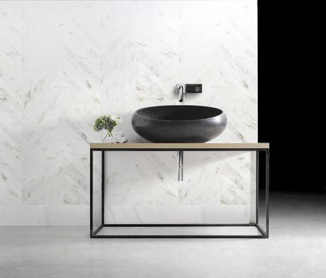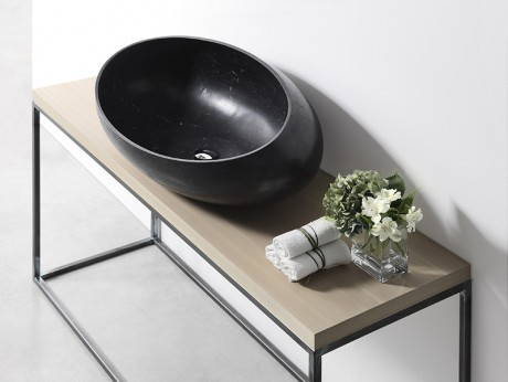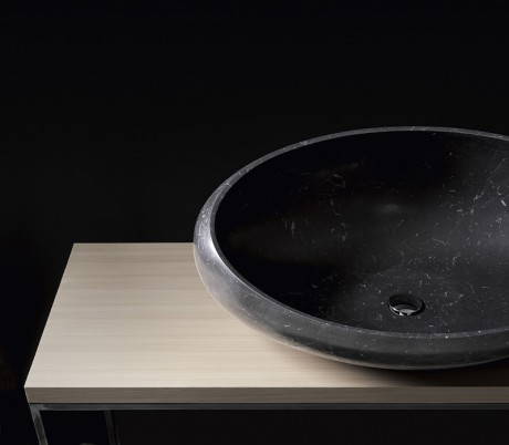 Gong è un lavabo da appoggio scavato nel marmo, che ricorda le linee di una conchiglia. Disegnato per Kreoo da Enzo Berti, Gong ha una struttura dal sapore primordiale che esalta le linee e la funzione del lavabo. Non più solo una funzione ma un oggetto dal grande potenziale evocativo. Per Gong la conformazione classica del sasso ellissoidale è stata interpretata con un taglio diagonale: ne risulta un ovale scavato con una tecnica minuziosa e finissima che rende l’involucro di marmo armonioso, leggero e, nei materiali più chiari, quasi opalescente. Gong è appoggiabile su top in legno o in marmo come su mobili a cassettoni. La base è volutamente discreta e passa decisamente in secondo piano, perché questo lavabo è capace da solo di riempire lo spazio.