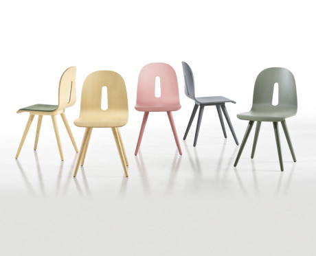 Ad arricchire ulteriormente la collezione Woody, entra anche la Gotham imbottita, realizzata con un morbido tessuto che evidenzia il profilo della scocca grazie ad un sottile bordo in rilievo. Gotham Woody è disponibile anche nella versione lounge, pensata i momenti di relax. Per ciascuna versione viene proposta la seduta , anche con braccioli, e lo sgabello a doppia altezza di 65 e 80 cm.