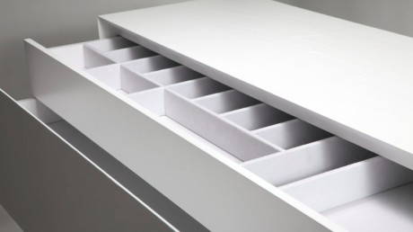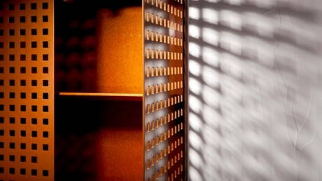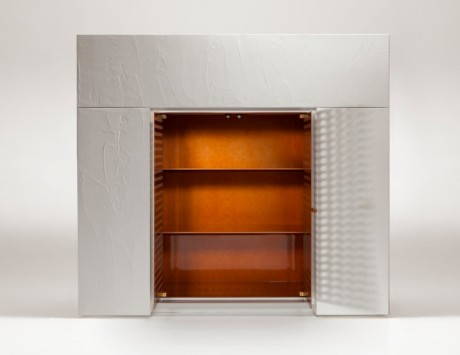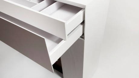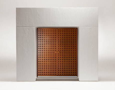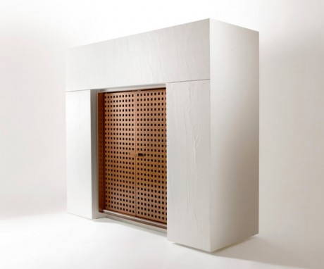Il carattere che accomuna ogni prodotto di Insidherland è quello di provare a costruire un legame affettivo con i suoi possessori. Homeland è una credenza dall’aspetto di un casolare (o di un portone, fate voi…) in modo da evocare uno spazio familiare e accogliente, con spesse pareti irregolari coperte di calce e verniciate a mano, che danno un tocco semplice e artigiano alla struttura e rendono ogni Homeland un pezzo unico. Una volta aperte le due porte basculanti in metallo verniciate a lucido si accede ad uno spazio interno dotato di quattro ripiani con finitura opaca e due cassetti superiori foderati di velluto bianco, che offrono una delicata accoglienza. L’interno simboleggia il calore e il comfort della casa, e il colore della vernice riecheggia quello della terra, in modo da offrire un prodotto che renda la casa un luogo il più possibile caldo e familiare. Il design e la progettazione di Homeland è stata curata da Insidherland, la realizzazione è stata affidata ad aziende e artigiani portoghesi.