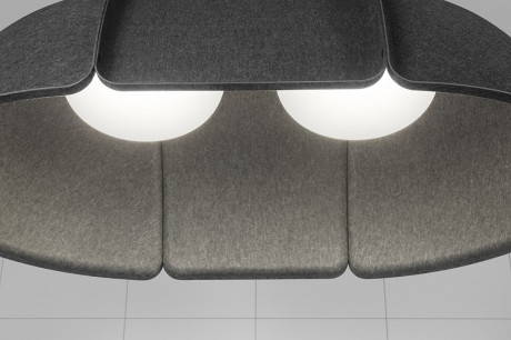 Nasce così Hood, una soluzione ideale per ogni tipo di ambiente, soprattutto gli open space, dove c’è bissogno di una fonte di luce e di una barriera che ammortizzi il suono, contribuendo a creare uno spazio più intimo. Grazie alla sua struttura modulare, Hood può crescere a seconda delle necessità. Il suo grande cappello, infatti, si compone di tre tipi di moduli diversi in feltro stampato: un angolo, i pannelli laterali e quelli superiori, e offer la possibilità di creare una struttura che misura da 1200×1200 mm fino a 1800×3000 mm nella sua massima dimensione. Hood è disponibile in 5 colori: nero, grigio scuro, grigio chiaro, sabbia, rosso.