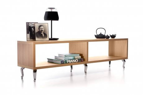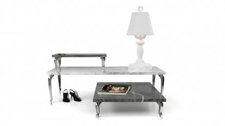 Il filo conduttore della collezione sono i piedini classici in alluminio cromato lucido, il cui stile morbido e grazioso contrasta con la geometria rigorosa degli arredi.
