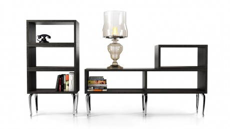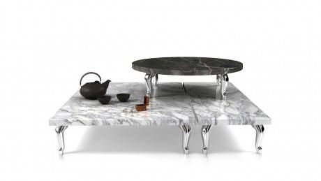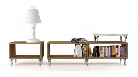 Il sistema modulare comprende una vasta gamma di credenze e tavolini tutti diversi tra loro: piccoli, grandi, alti, larghi, rotondi, rettangolari, quadrati, in legno (i contenitori) o in marmo di diversi colori (per il top dei tavolini).
