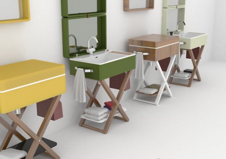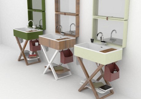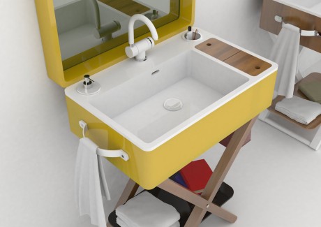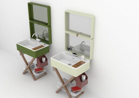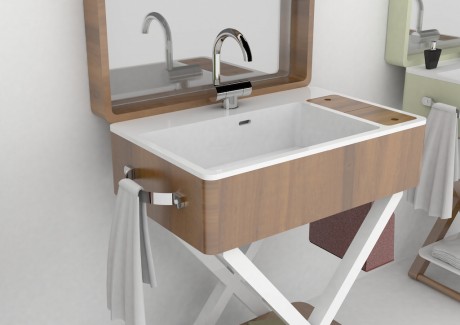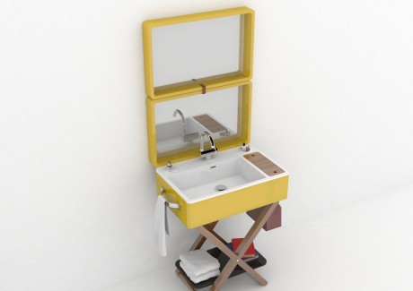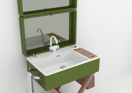 My.Bag è un sistema lavabo progettato da Gianluca Paludi che può essere chiuso all’occorrenza, trasformandosi in un semplice piano d’appoggio. Aperto, invece, nasconde diversi segreti: il top della ‘valigia’ ospita una grande specchiera, il contenitore laterale in pelle si trasforma in un portaoggetti, la maniglia diventa porta salviette e, infine, il coperchio in legno nasconde un piccolo vano, con lo specchio per il trucco. I rubinetti sono abbattibili per consentirne facilmente la chiusura.