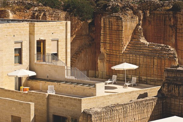 Il complesso di edifici che costituisce il Cave Bianche Hotel è realizzato con la stessa pietra dorata scavata dalle rocce circostanti. Le pareti verticali della cava diventano quinte scenografiche illuminate da giochi di luce dall’effetto teatrale.