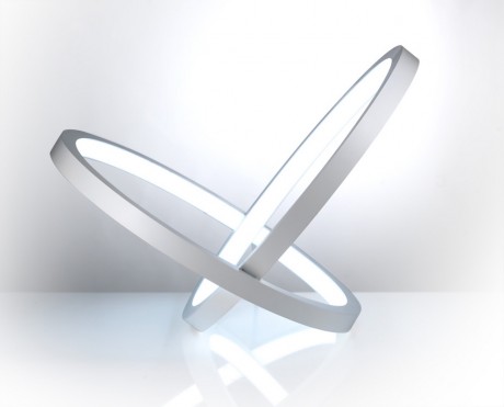 I due cerchi, l’elemento base di questa struttura, si intersecano in maniera casuale, generando sempre nuove forme da ogni punto di vista, il tutto avvolto da un fascio di luce a Led, generato dagli stessi anelli.