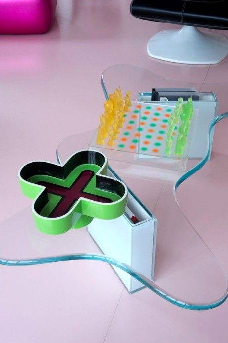 Tra i suoi pezzi più noti, spiccano nel living il divano “Kivas Couch” rosa shocking, viola, silver e gold di Valdichienti e il “Matrix Sofa Sistem” di Meritalia, la chaise-longue “Dragonfly” di Bonaldo, la “Swing Chair” di Frighetto e il coffeè-table “Splash” disegnato di Tonelli.