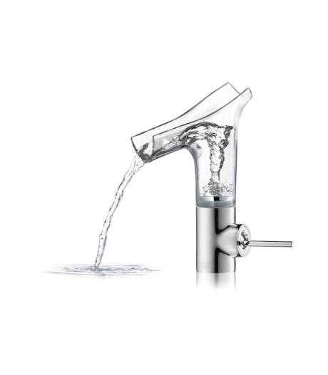 E’ in vetri il nuovo miscelatore Axor Starck V disegnato dal genio di Philippe Starck per Axor. Il designer francese ha portato sul lavabo solo l’essenza dell’acqua, la sua trasparenza, la sua ‘non-forma’, arricchendola con un vortice bello da vedere che ne rende ancora più piacevole l’uso. Axor Starck V (dove V sta appunto per Vortice) è composto da una ‘base’ che contiene la cartuccia di miscelazione e si installa come ogni rubinetteria; su questa si inserisce con un semplice click un corpo in vetro. Passando attraverso uno speciale erogatore, che imprime l’effetto naturale del mulinello, l’acqua sale fino a sgorgare sul lavabo. L’effetto è di quello di una sorgente, che comunica abbondanza e naturalezza anche se il consumo è inferiore alla metà di una normale rubinetteria.