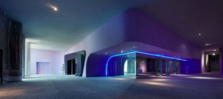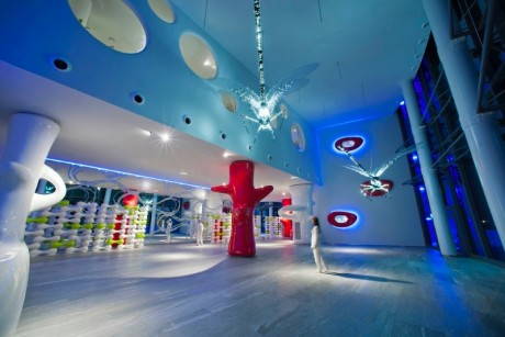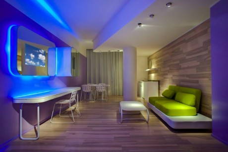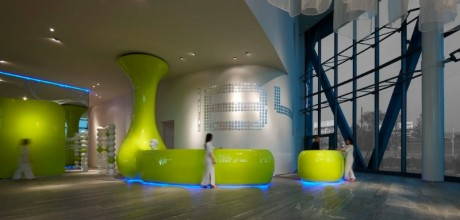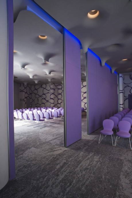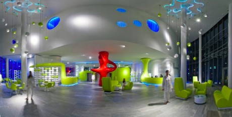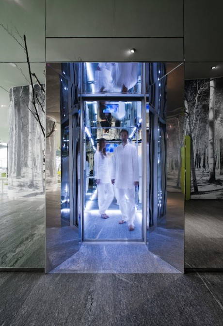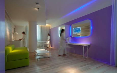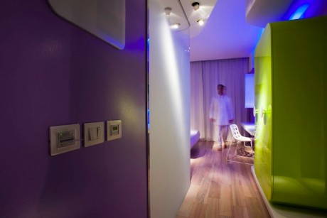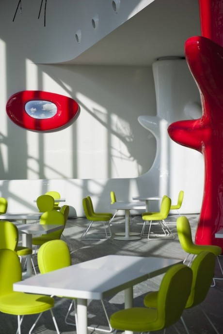 Alla maestosità architettonica dell’esterno si contrappone un ambiente interno dalle atmosfere morbide e rilassanti, dove le superfici bianche sono spezzate da elementi e arredi che sembrano sculture. Pochi i colori usati. Verde, rosso, lilla, che contrastano con il colore chiaro dei pavimenti in legno e in pietra.