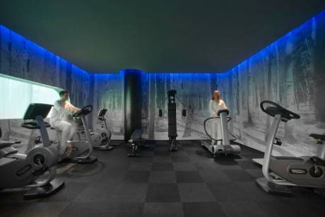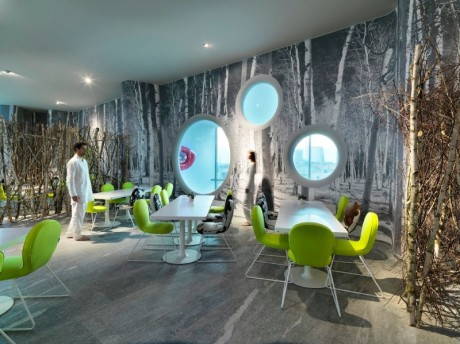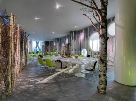 Colonne fitomorfe ed elementi architettonici dalle linee organiche dialogano con tronchi d’albero veri e proiettati sulle pareti della sala colazione.