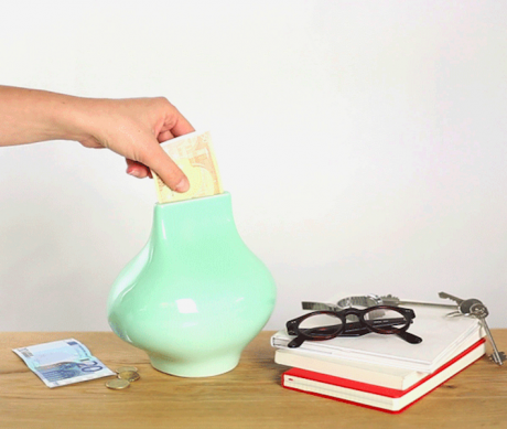 Questo particolare oggetto si distingue dai tradizionaali salvadanai perc la sua forma inusuale e soprattutto per la “bocc”a allungata che non serve infatti solo per risparmiare le monete ma anche le più preziose banconote.