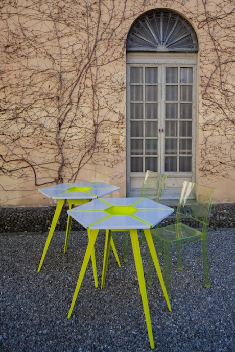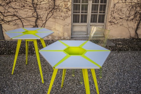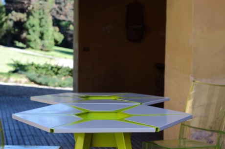 La struttura metallica, tagliata al laser, crea una forma esagonale, così da essere facilmente abbinato in diverse composizioni formate da più tavoli.
