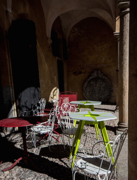 È stato concepito piegando la lamiera come un origami 6SIT, il tavolo esagonale disegnato da Giuliana Gatti per Officine Tamborrino.