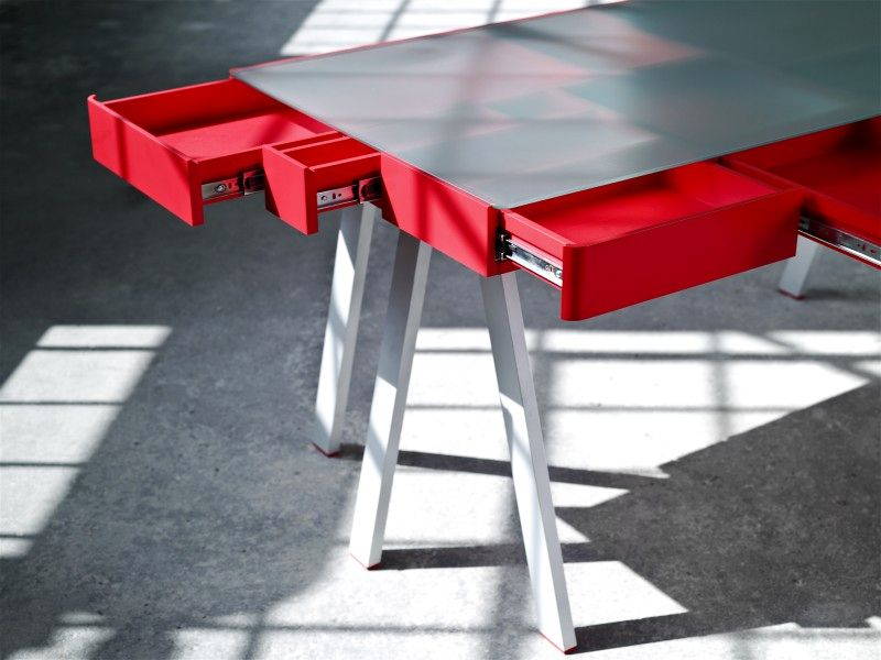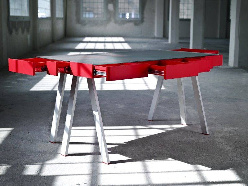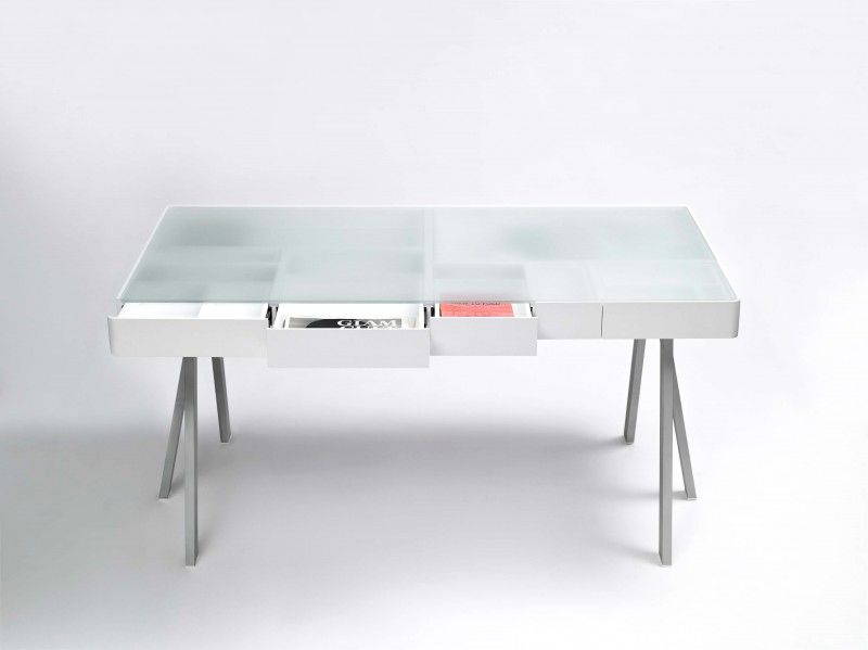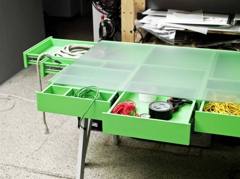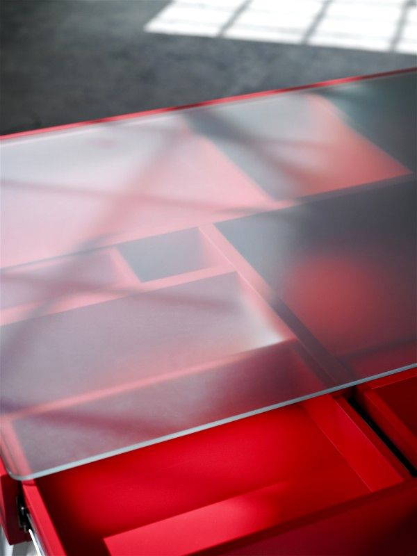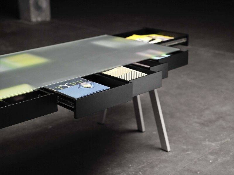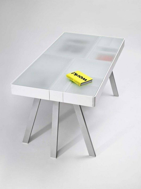 The Treasury Table è una soluzione originale per tenere in ordine e “sotto controllo” la propria scrivania: le linee del tavolo sono semplici e pulite, e sei gambe sorreggono un grande contenitore di MDF verniciato suddiviso in cassetti di varie dimensioni. Un coperchio di vetro traslucido copre il vano e funge da piano d’appoggio; il gioco di trasparenze permette di avere sempre sotto gli occhi il contenuto di tutti i cassetti, pensati per contenere non solo oggetti di cancelleria ma anche grandi formati di carta, da quello A5 a quello A2.