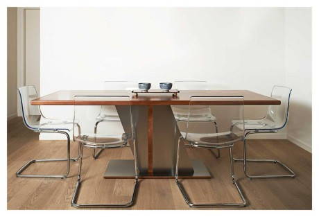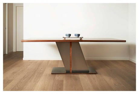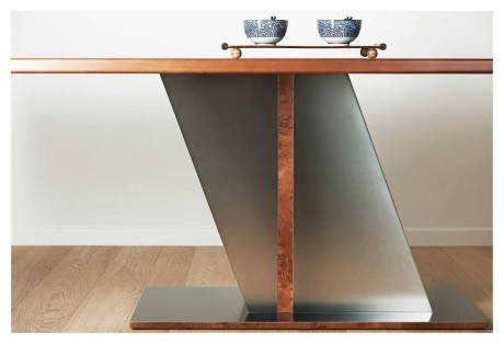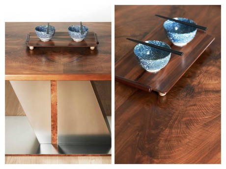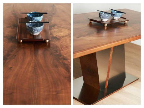 Piuma è un evidente omaggio al rigore minimalista giapponese da parte dei designer dello studio Li-Ving che nel progettarlo sono partiti dal riutilizzo di un vecchio pannello in piuma di noce utilizzato come top, sorretto da una base rivestita in acciaio inox satinato, impreziosito da inserti in piuma di noce posizionata asimmetricamente rispetto al piano. Piuma prende il nome proprio dal materiale con cui è stato realizzato.