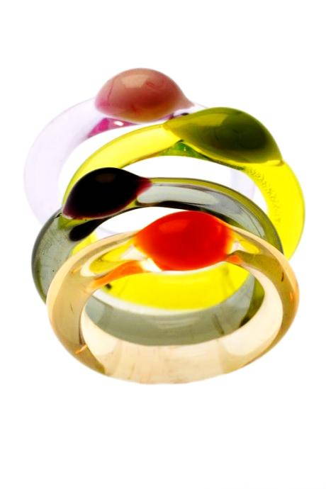 Gli anelli sono realizzati ad uno ad uno e rigorosamente a mano, in vetro fuso a cannello, da un maestro vetraio muranese, e sono arricchiti da finiture e dettagli che creano l’emozione del pezzo unico.