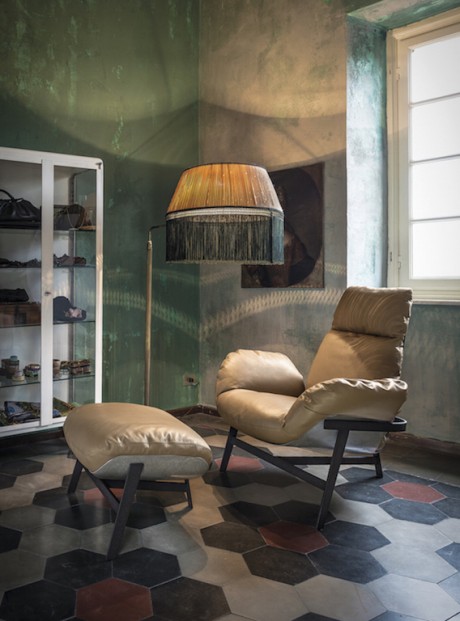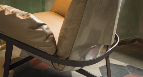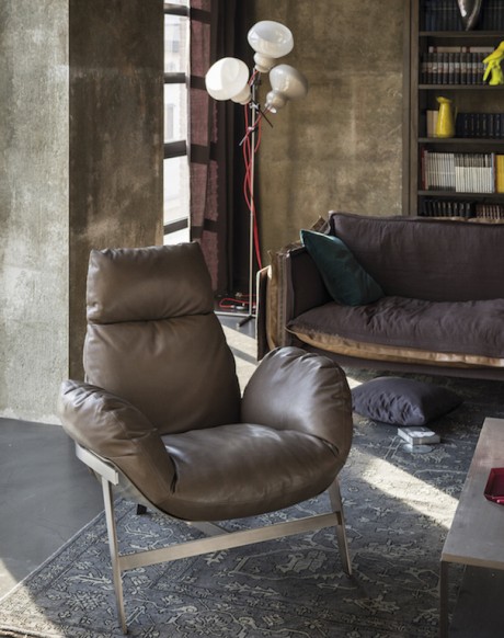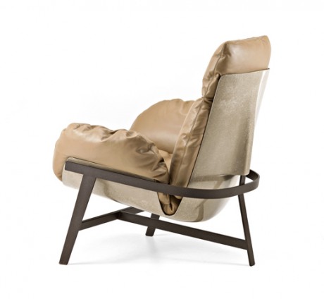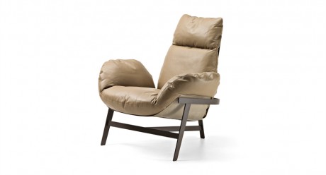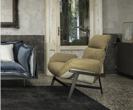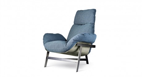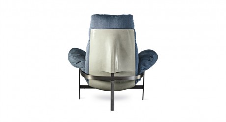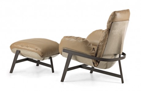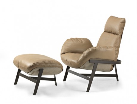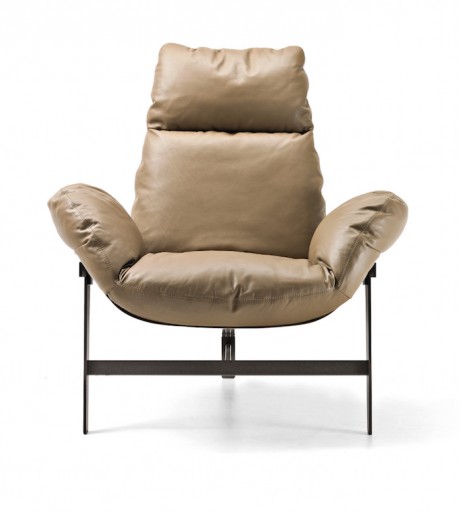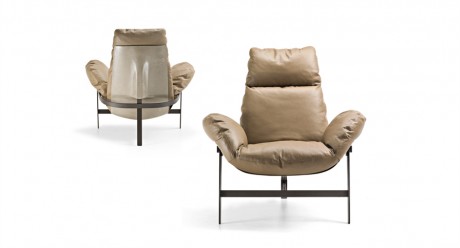 Ne nasce una poltrona con pouf bella e accogliente, ergonomica e architettonica, caratterizzata da un design leggero e dinamico che va oltre le mode. La struttura è in metallo piegato ad arco per accogliere il guscio in vetroresina. Schienale alto, contrappunti e monoblocchi sagomati in piuma assicurano il massimo comfort.