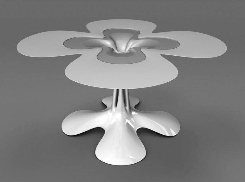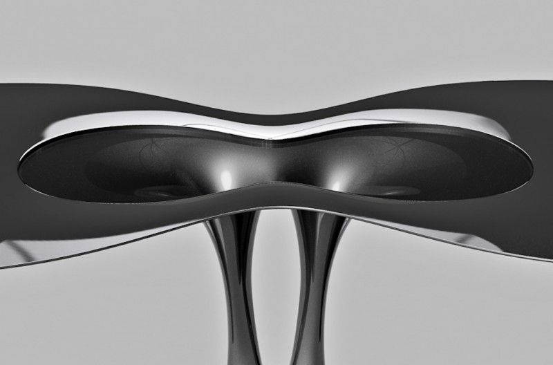 Il progetto infatti è l’ultimo sviluppo di un lavoro iniziato da Philipp tempo fa e che era partito con il Singularity Table e poi proseguito con il Shamrock Table, il tavolo a quadrifognio, entrambi caratterizzati da questa forte idea di “risucchio” gravitazionale nella colonna centrale. Aduatz crea oggetti di design con un approccio scientifico, sfruttando sofisticati programmi di simulazione computerizzata che ricreano situazioni altrimenti impossibili da immaginare come la recente Melting Chair, una sedia che sembra fermare, magicamente, una colata di metallo.