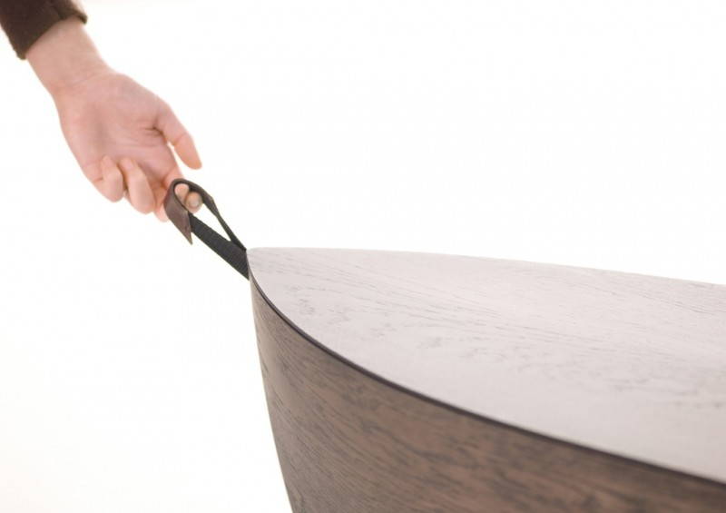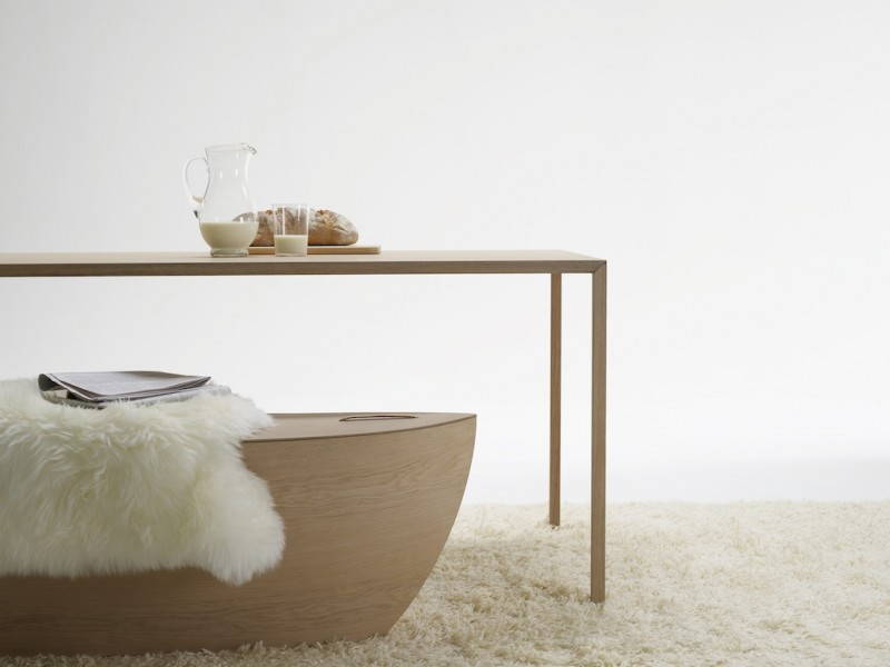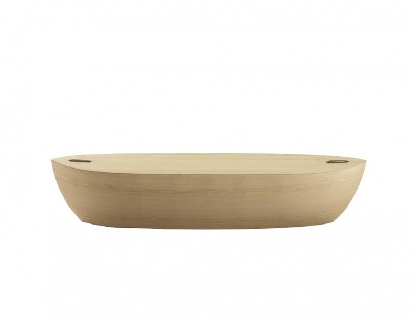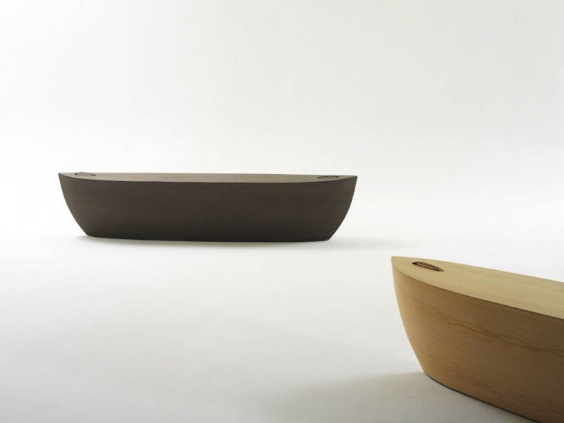 Il “corpo” di Arc è realizzato con rovere impiallacciato, mentre la superfice è di legno massello. Il suo ideatore voleva scavare e intagliare un tronco d’albero fino a fargli assumere la forma di una nave: durante il processo di lavorazione però ha preferito lavorare su tanti strati di legno, sottili come lamine, in modo da poterli poi unire e modellare seguendo le linee del disegno prestabilito. Arc sembra davvero una barca, semplice ma molto compatta, capace di catturare lo sguardo con eleganza. Un oggetto pulito, arricchito da maniglie di pelle che ne facilitano lo spostamento. Che la si usi come panca, come tavolo o come ripiano, in ogni caso può essere sfruttata in qualsiasi ambiente, dal bagno alla camera da letto, dal salotto all’ingresso.
